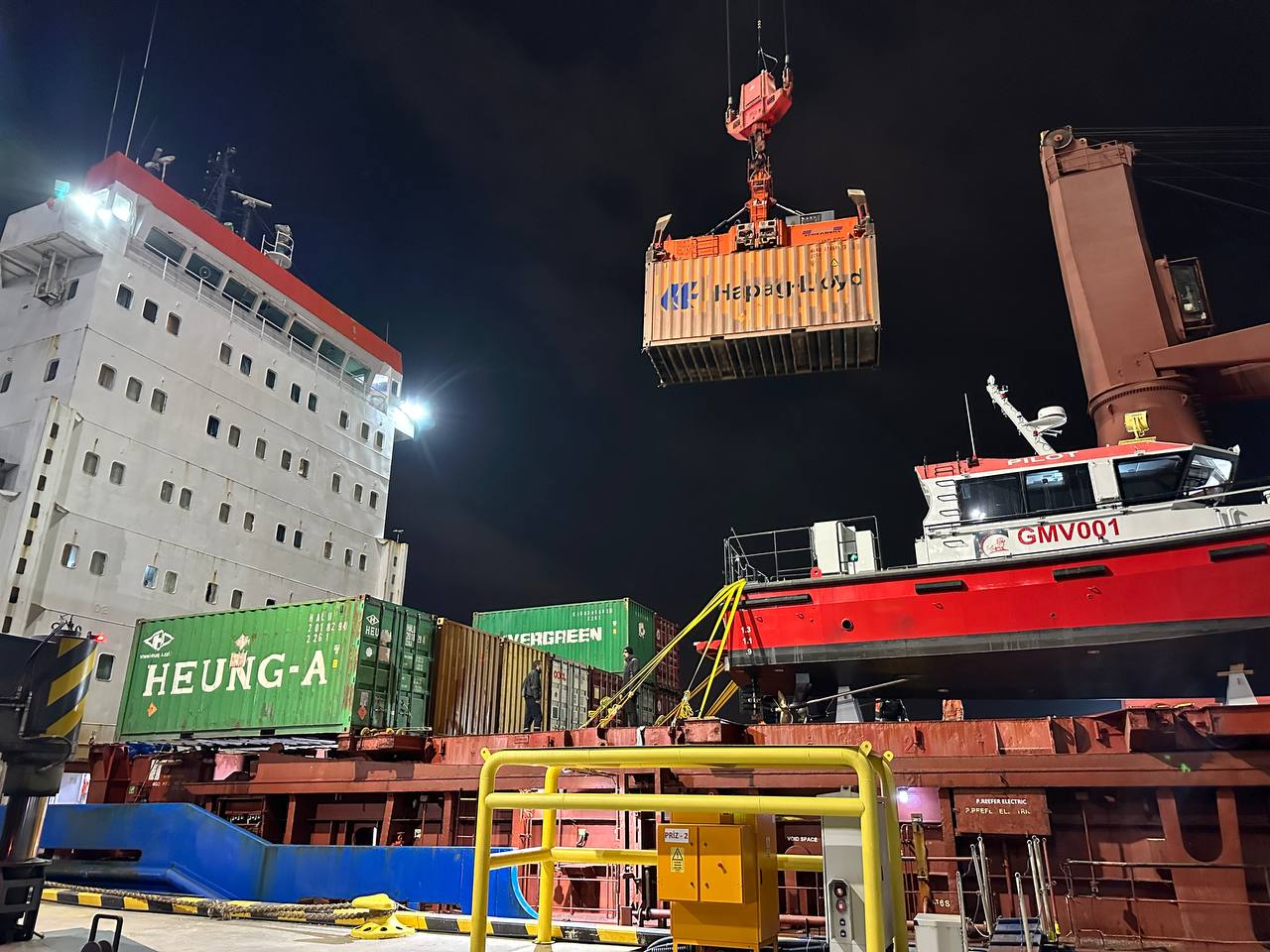 Önce tekne sabitlemeleri tamamlandı, ardından konteyner yükü ayrı hat düzeniyle ikinci fazda bağlandı.