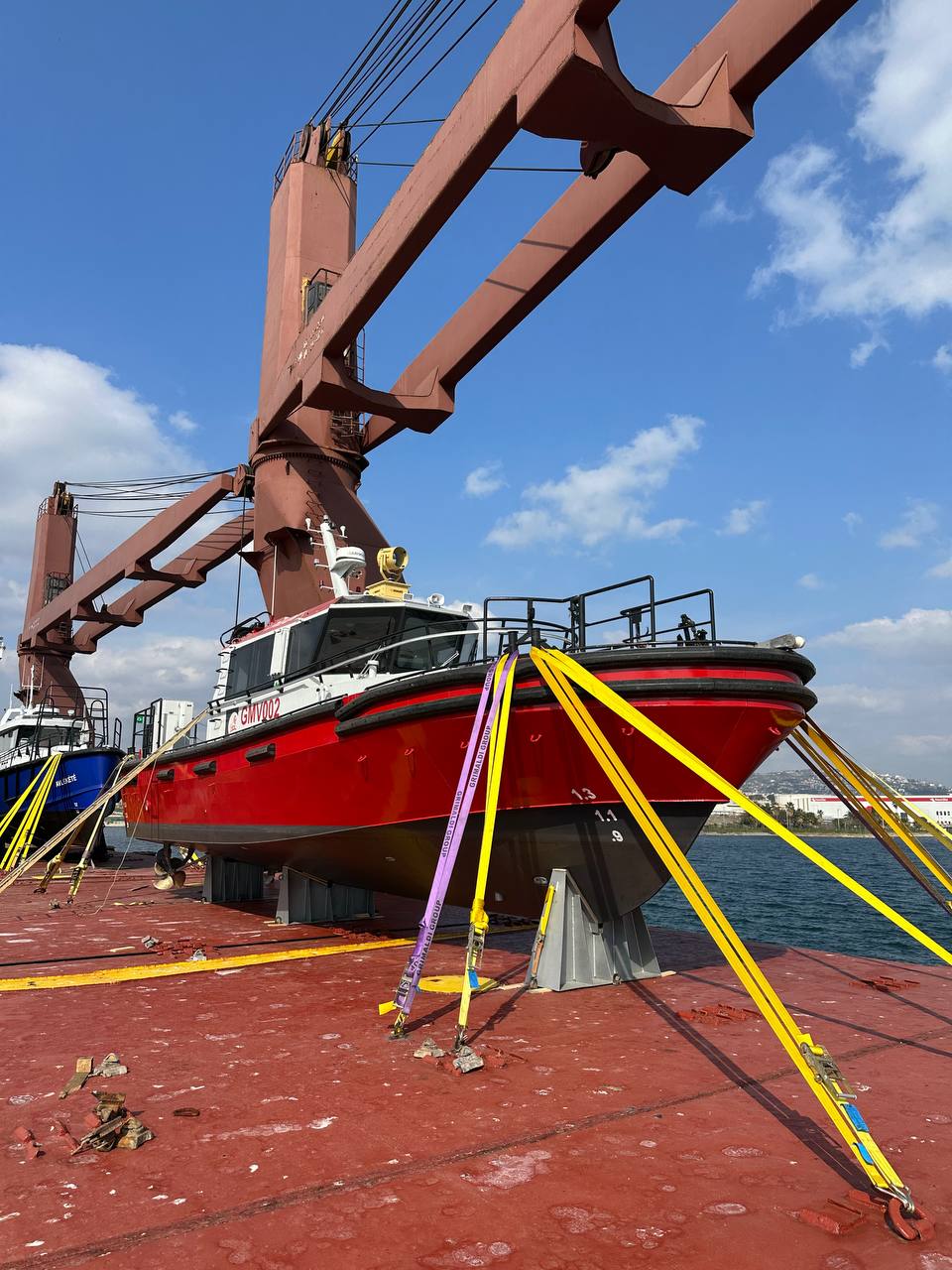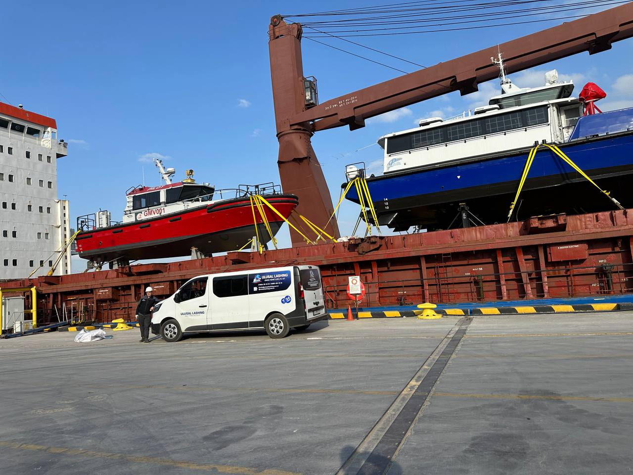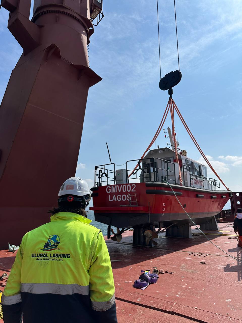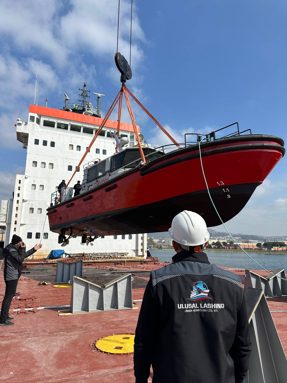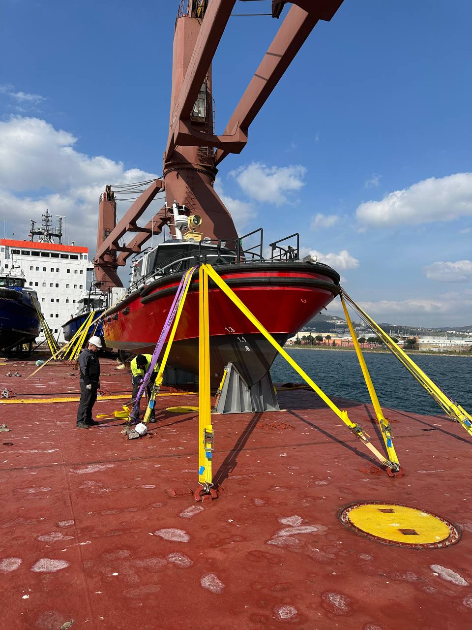 6 Mart 2026 tarihinde 67 tonluk tekne ve 49 tonluk yardımcı parçanın güvenli sevkiyat için lashing operasyonu.